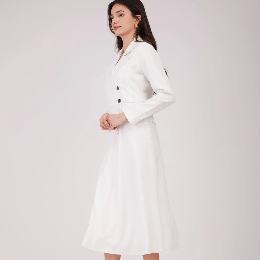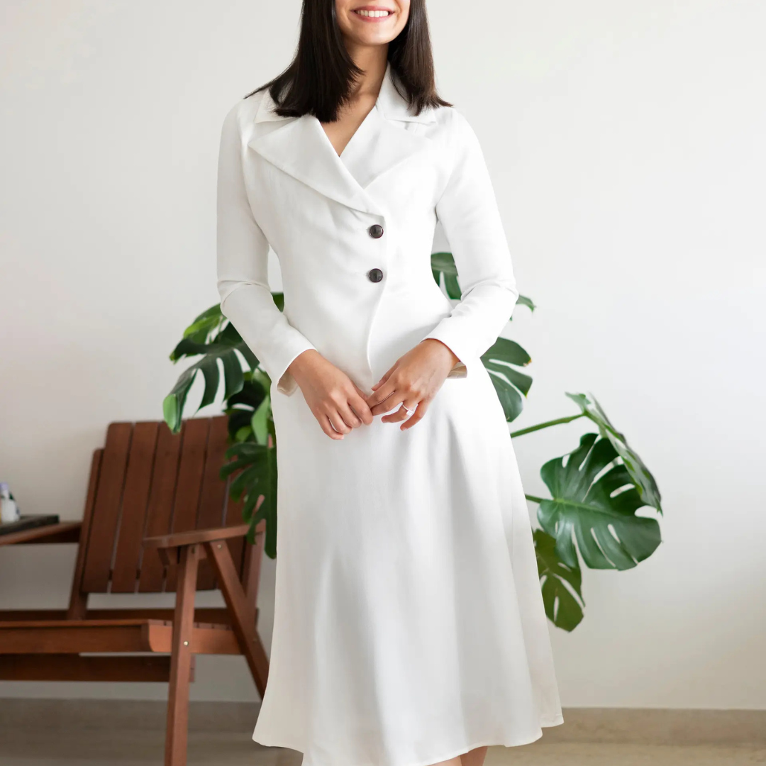 Elegant white A-line jacket dress with crisp structure. Perfect for polished and graceful occasions.