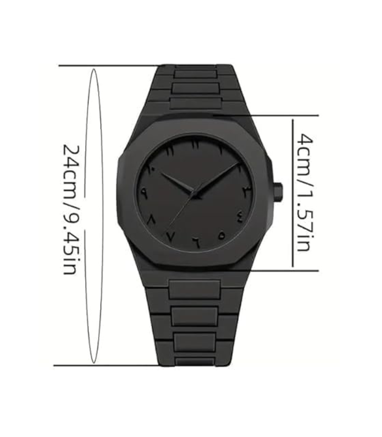 - DESIGN: Matte black minimalist analog watch featuring Arabic numerals and sleek construction for a contemporary aesthetic LIGHTWEIGHT BUILD: Ultra-light 42-gram construction makes this timepiece comfortable for all-day wear MATERIAL: Durable plastic construction with matching black metal bracelet for a cohesive, modern look DISPLAY: Clear analog display with Arabic numerals for easy time reading in a sophisticated layout STYLE VERSATILITY: Trendy all-black design perfectly complements both casual and formal attire