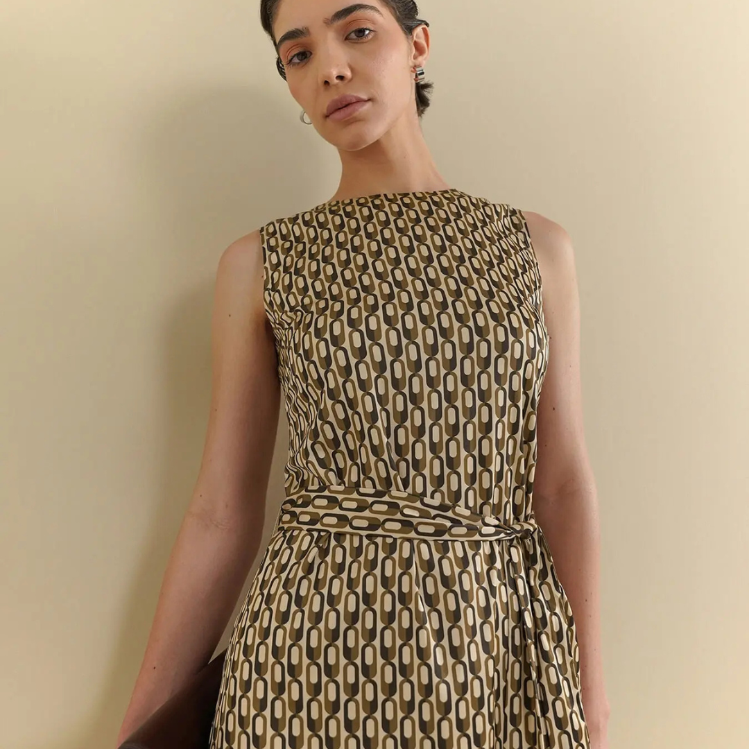 Modern beige A-line dress with bold geometric prints. A stylish blend of structure and creativity.