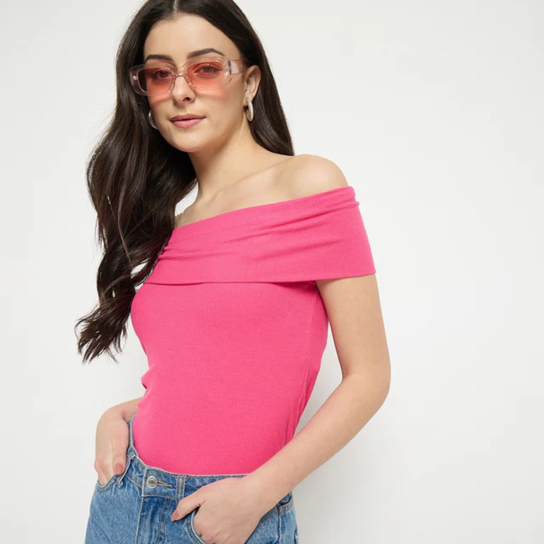 Bold hot pink off-sleeve top crafted in rayon blend fabric. Perfect for a glamorous and confident look.