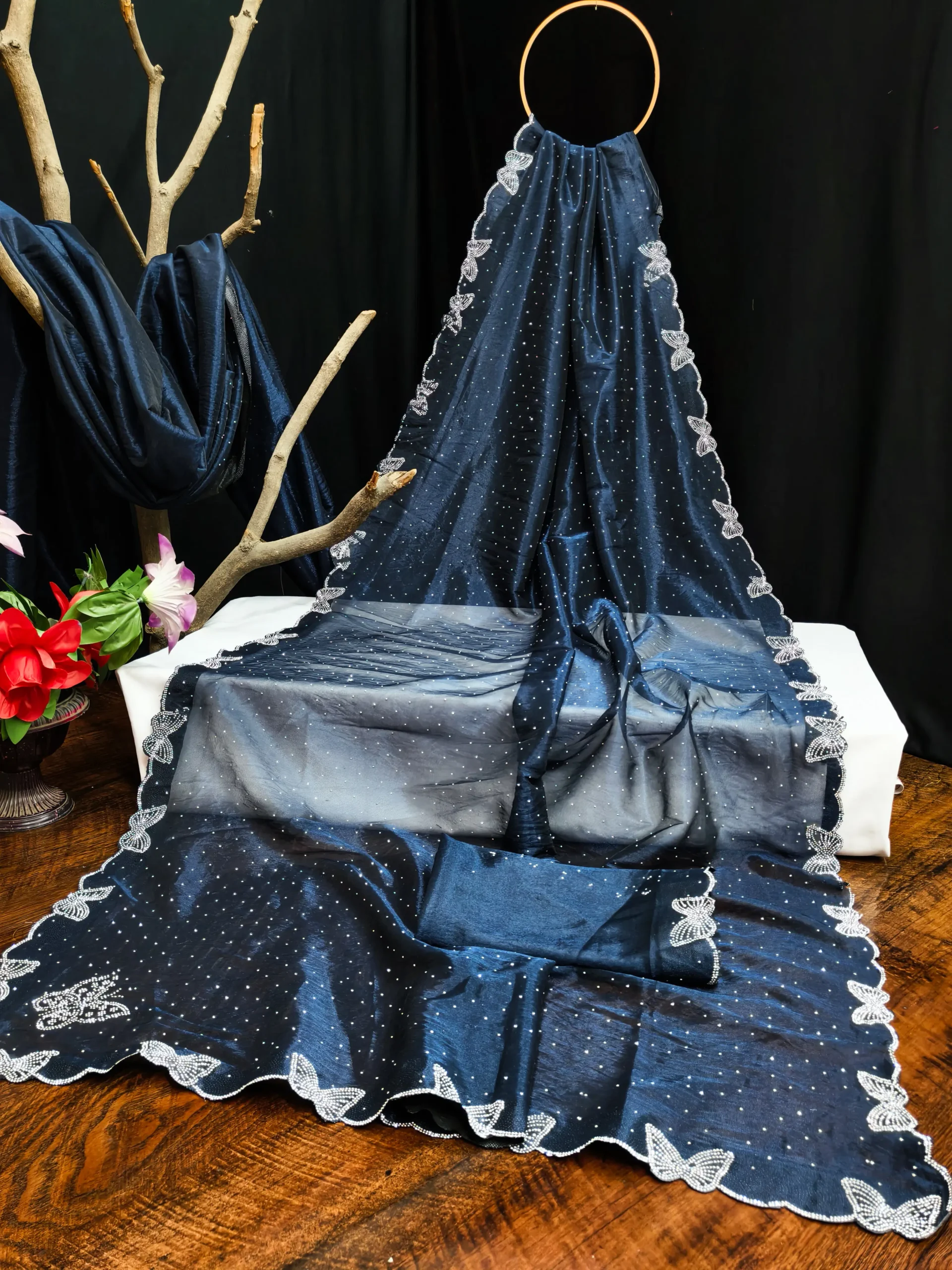 Butterfly Diamond Lace Work Saree With Unstitched Blouse Piece