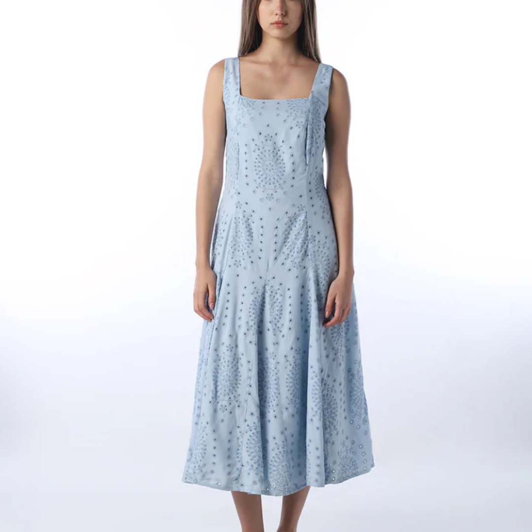 Elegant schiffli printed midi dress for a sophisticated and feminine look. Ideal for daytime elegance.